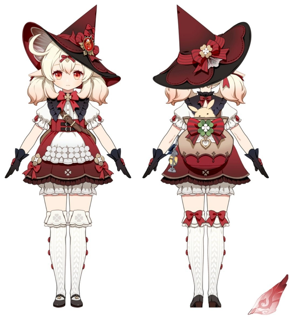 Предполагаемый наряд для малышки Кли, в наличии шляпа ведьмочки. Ожидается, что это наряд с 5 звездами редкости (в таком случае у облика будут альтернативные эффекты / анимации).