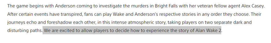 Remedy Entertainment объяснила, как это будет работать в Alan Wake 2: «После того как произойдут определённые события, фанаты смогут пройти истории Уэйка и Андерсон в любом выбранном ими порядке. Их путешествия перекликаются и предвещают друг друга в этой напряженной атмосферной истории, ведя игроков по двум разным темным и тревожным путям».