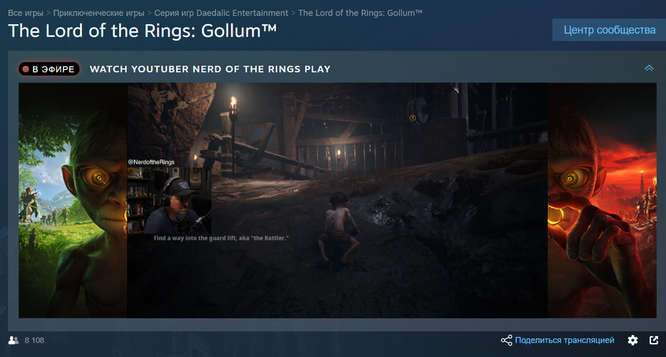 На страницах магазина Steam некоторые разработчики запускают трансляции. Так случилось и с The Lord of the Rings Gollum, показали блогера Nerd of the Rings.