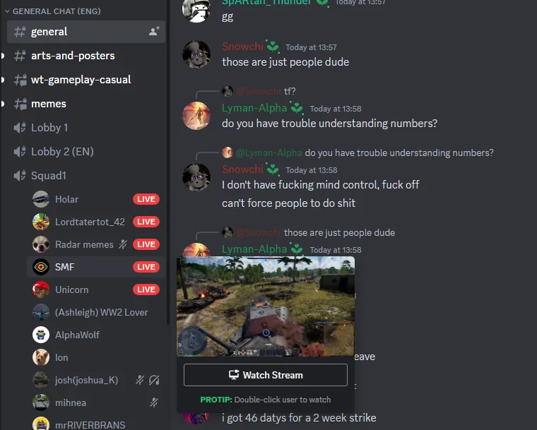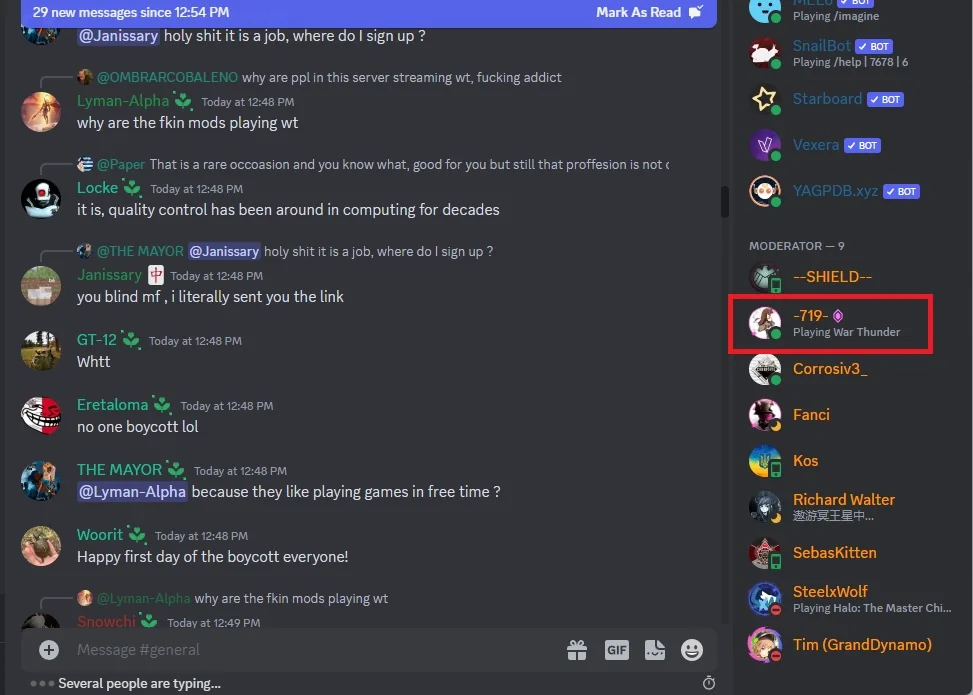 Онлайн War Thunder на ПК в Steam едва просел, а «главные звёзды» этого бойкота долго не смогли продержаться и вскоре вернулись к игре. Внимательные пользователи застукали их в War Thunder, их выдал статус в Discord и трансляции игры.