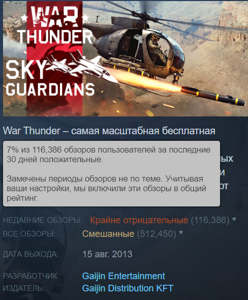 Тем временем War Thunder продолжают громить в Steam. Если убрать фильтр обзоров «не по теме», то можно увидеть, что за последние 30 дней игра получила 116 тысяч отзывов (из них 93% отрицательные).