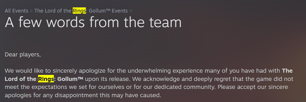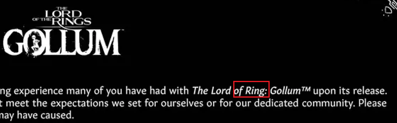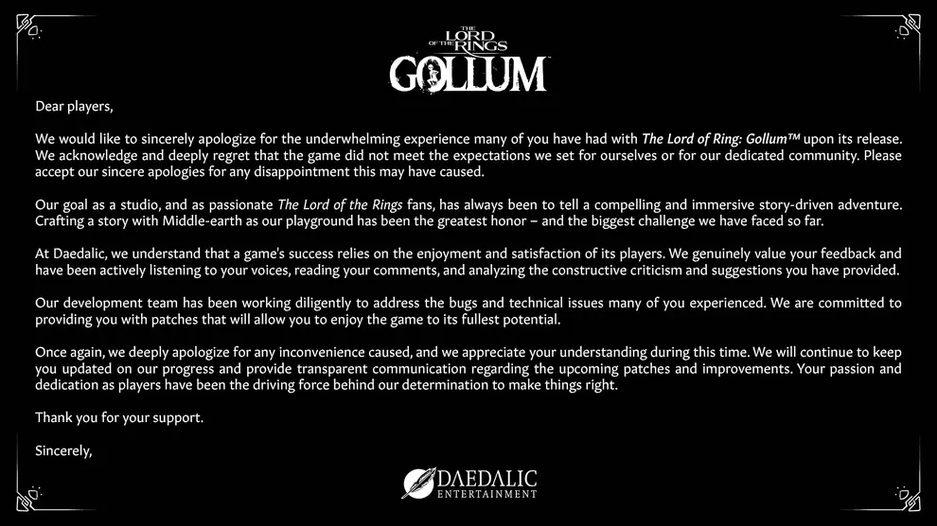 The Lord of the Rings Gollum прославилась не только низким качеством. Разработчики выпустили заявление, которое тоже выполнено не самым лучшим образом