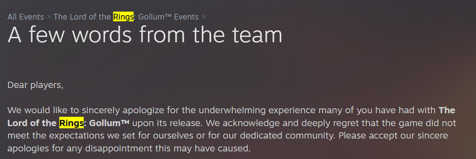 Многие пользователи лишь посмеялись над авторами The Lord of the Rings Gollum, поскольку такие заявления-извинения в последнее время стали своеобразным трендом — выпускают много не очень хорошо сделанных игр и затем публикуют схожие заявления.