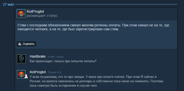 Судя по комментариям, эта проблема актуальна не только для российских геймеров, но и Западного сообщества. Аккаунт из Турции или Аргентины могут произвольно переместить в США или Европу. Ранее многие издатели жаловались на участившиеся случаи злоупотребления региональными ценами (в турецком и аргентинском Steam).