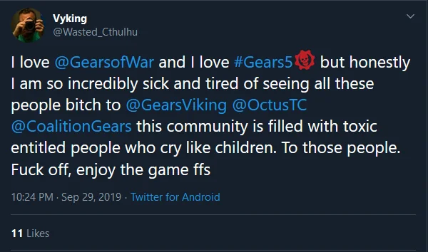 На жаркое обсуждение обратил внимание поклонник Gears 5. Ivarthemicro17 припомнил инцидент 2019 года: заявляется, что Роду Фергюссону понравилось сообщение, автор которого некорректно отзывался о «токсичных» фанатах Gear of War – Vyking писал, что они плачут как дети.