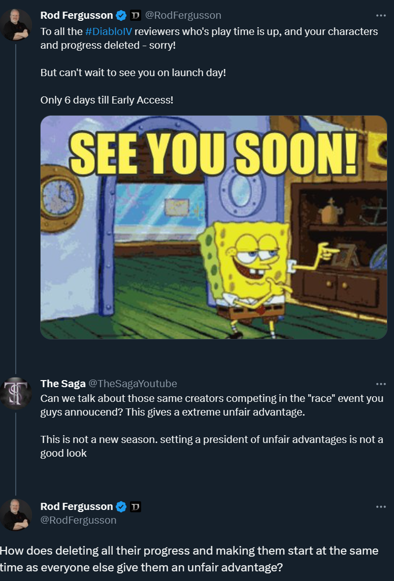 Сначала Род Фергюссон написал: «Всем рецензентам Diablo 4, у которых закончилось время игры, а ваши персонажи и прогресс удалены — простите!