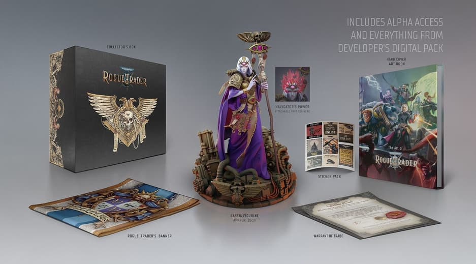 Разработчик продемонстрировал коллекционное издание Warhammer 40,000: Rogue Trader. В него войдут такие дополнения, как фигурка штурмана Кассии Орселлио, флаг и книга с иллюстрациями из игры.