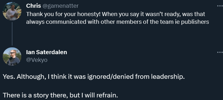 «Да [о том, что Anthem не готова, сообщалось всем]. Хотя, я думаю, это было проигнорировано / [сознательно] отвергнуто руководством.