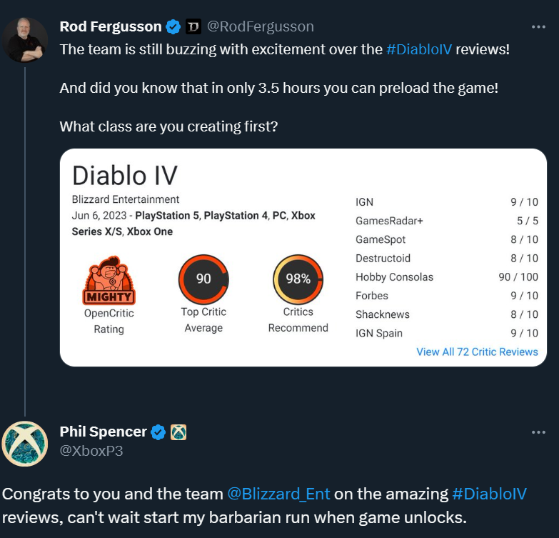 Босса франшизы Diablo Род Фергюссон (Rod Fergusson) похвастался оценками, которые получила Diablo 4, средний балл составил 90 и практически все рецензенты рекомендовали познакомиться с игрой. Кое-кто обратил на это внимание.