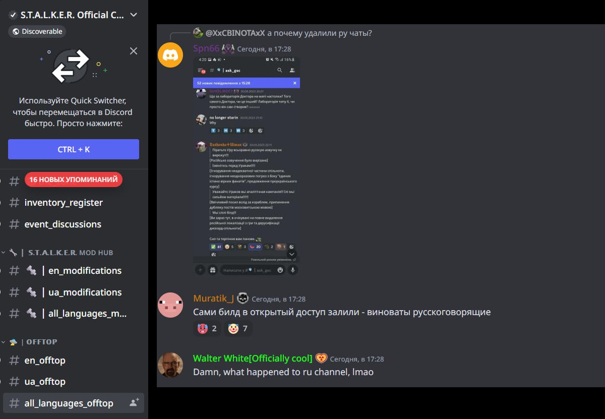 Также пользователи заметили, что GSC Game World «в официальном дискорде по Сталкеру переименовали канал с ru_offtop на all_languages_offtop. Так сказать, оперативно отреагировали на произошедшее».