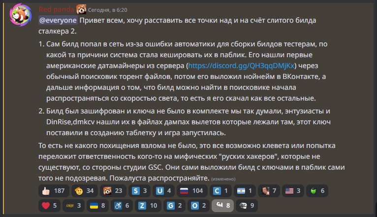 Заявление GSC Game World про неких русских хакеров разозлило пользователей, начали активнее копать. Мимо ситуации не прошёл моддер Red panda, который тоже высказался: