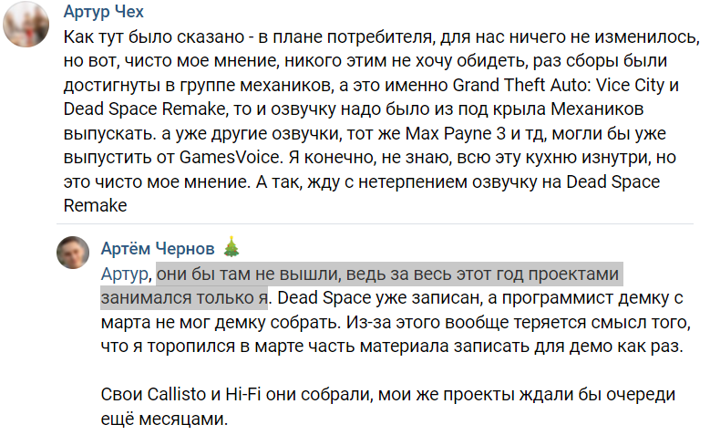 В сообществе GamesVoice Артём Чернов прокомментировал уход. По его словам, в Mechanics VoiceOver озвучки не вышли бы, поскольку за этот год проектами занимался только он. Например, озвучка ремейка Dead Space уже записана, а программист не мог собрать демку с марта.