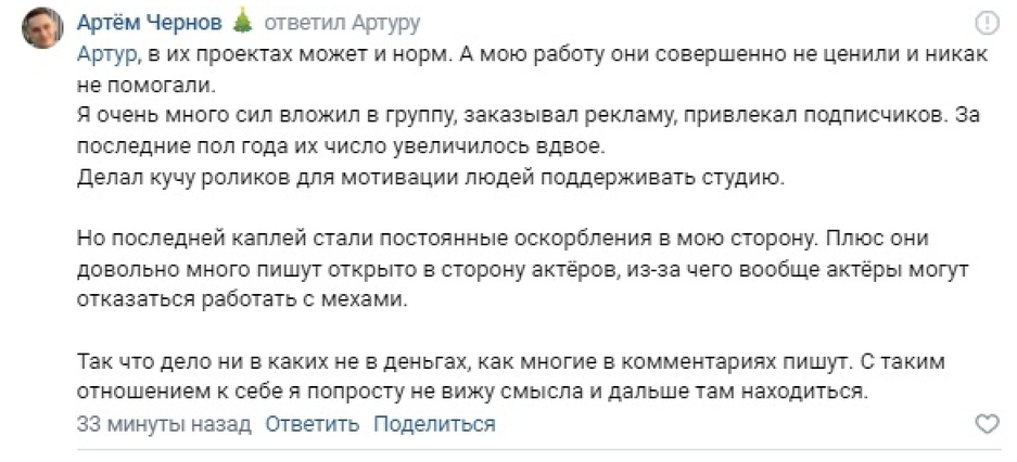 Проекты Артёма «ждали бы очереди месяцами». По его словам, в Mechanics VoiceOver его работу не ценили, помощи не оказывали. Последней каплей стали оскорбления в его сторону.
