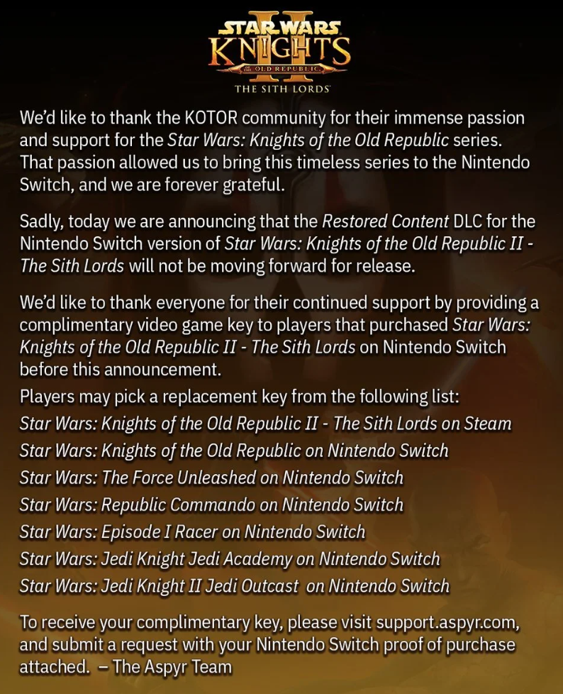 Однако Aspyr не просто «извинилась», как это обычно бывает в индустрии. Готовы предоставить Star Wars Knights of the Old Republic 2 для ПК в Steam или же один из релизов Star Wars для Nintendo Switch из списка ниже. Ключ получается через поддержку Aspyr.