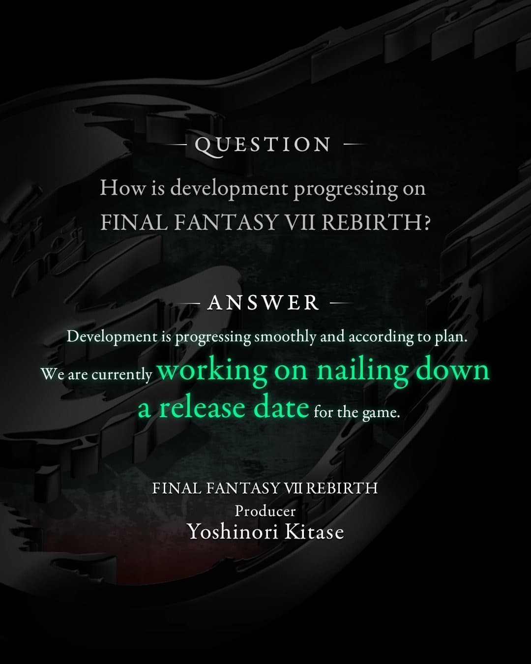 На странице Final Fantasy VII в Twitter появилось сообщение, в котором Китасэ подтвердил, что работа над Final Fantasy VII Rebirth «продвигается гладко и по плану», и что разработчики в «настоящее время работают над определением даты выхода игры».