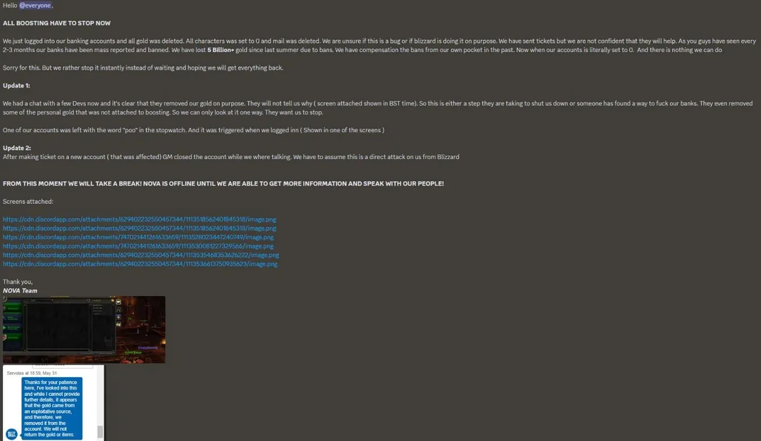 Теперь в World of Warcraft у них нет золота и им зачистили всю почту, произошло «обнуление». Nova Boosting Community приняла решение приостановить деятельность.