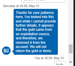В ходе общения с Blizzard подтвердили, что это не баг, а сознательное решение разработчиков. Причину толком не прояснили, получилось что-то вроде «золото получено путём эксплуатации игрового процесса» (говорят общими словами про некие эксплойты).