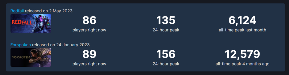 В июне 2023 года сложилась следующая ситуация: пиковый онлайн одиночной Forspoken в Steam превосходит свежую кооперативную Redfall.