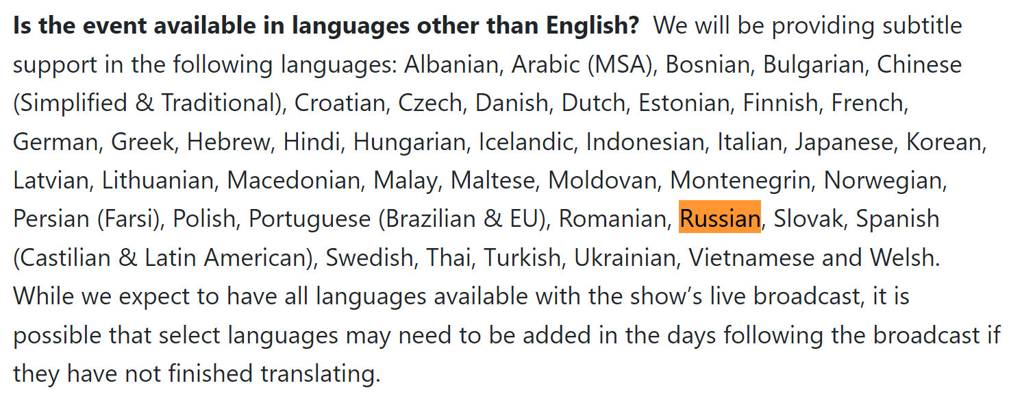 Однако дальнейшие действия Microsoft удивляют. Для трансляций презентаций Xbox Games Showcase и Starfield Direct заявлены русские субтитры.