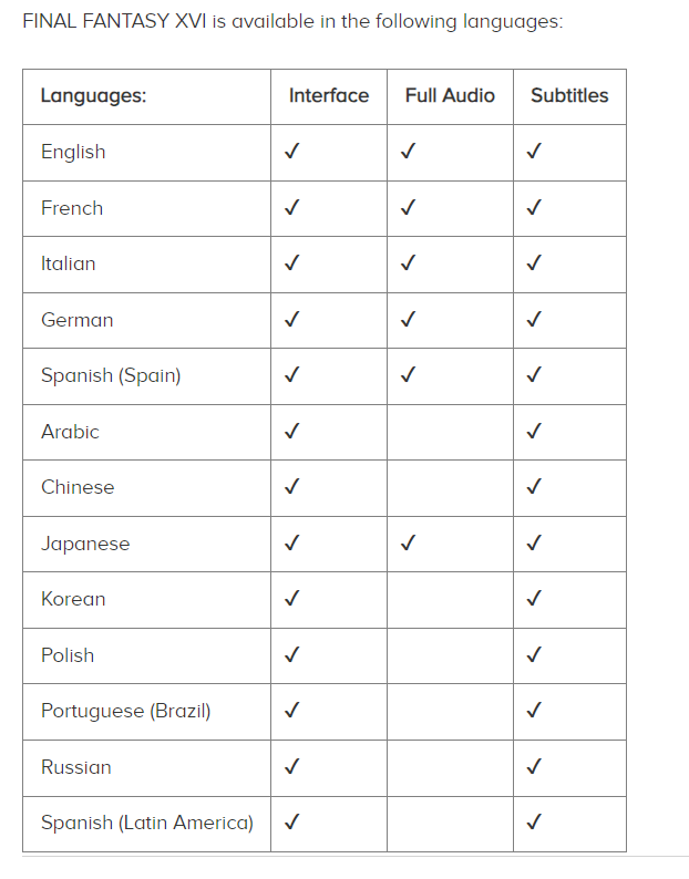Для Final Fantasy 16 заявлена озвучка на 6 языках — без русской озвучки, но зато есть английская, французская, итальянская, немецкая, испанская и японская. В наличии лишь русские субтитры.