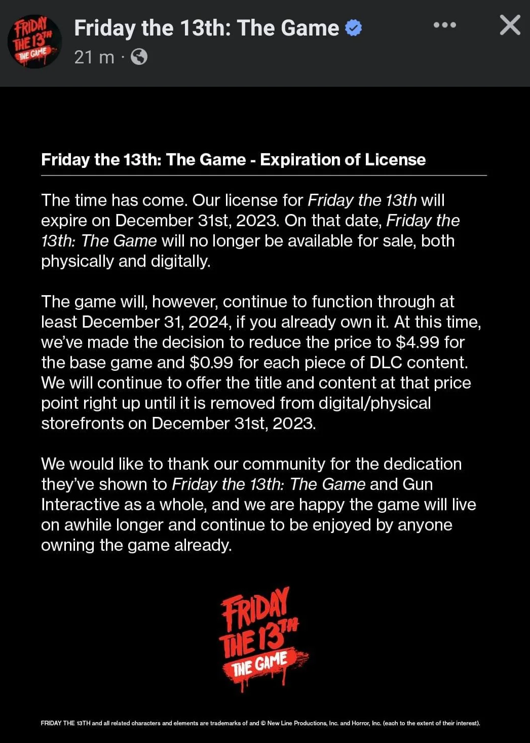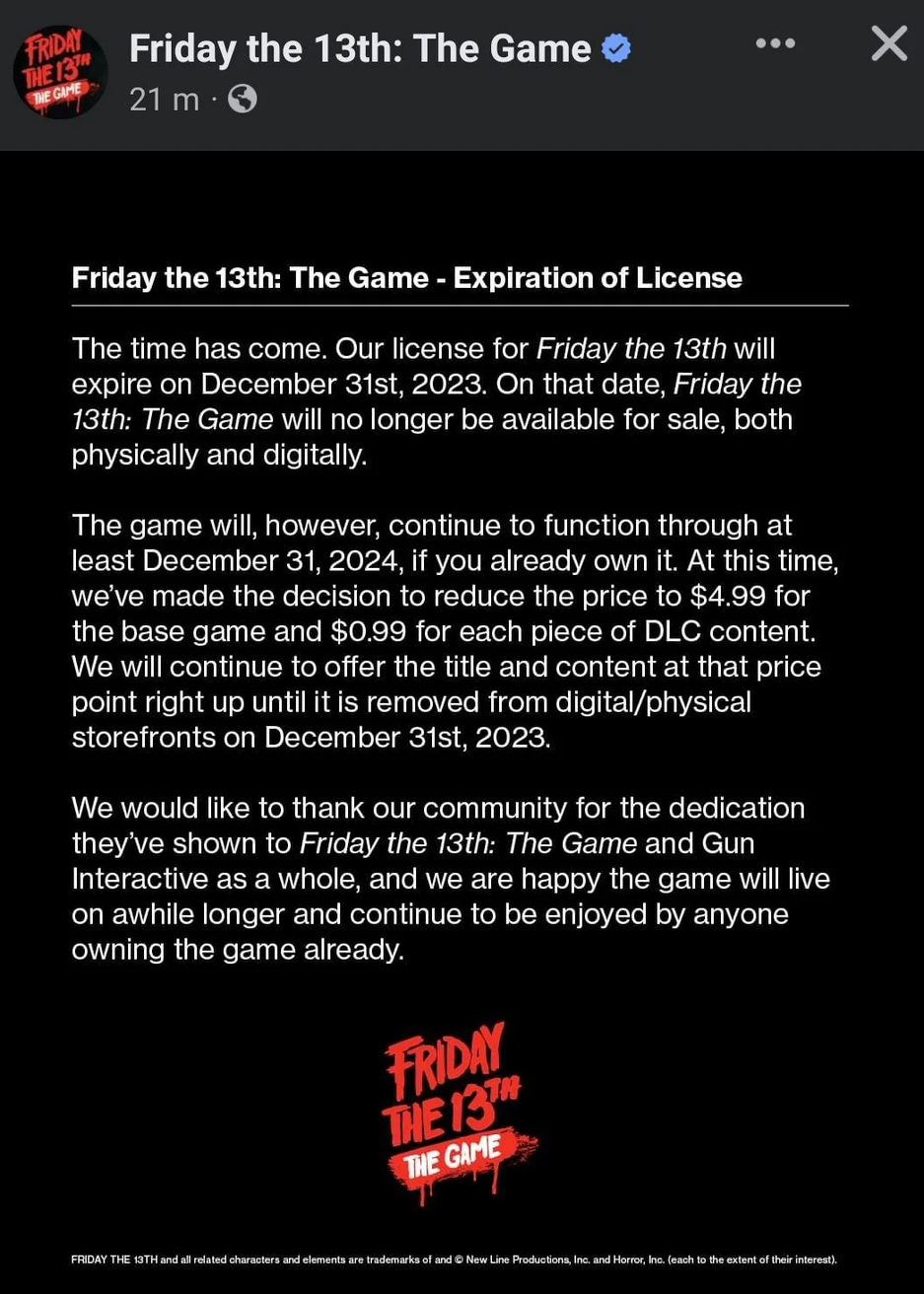 При этом после снятия продажи мультиплеерный хоррор Friday the 13th The Game продолжит жить дальше. Как минимум до 31 декабря 2024 года серверы игры будут работать. Более далёкие планы пока не обозначили.