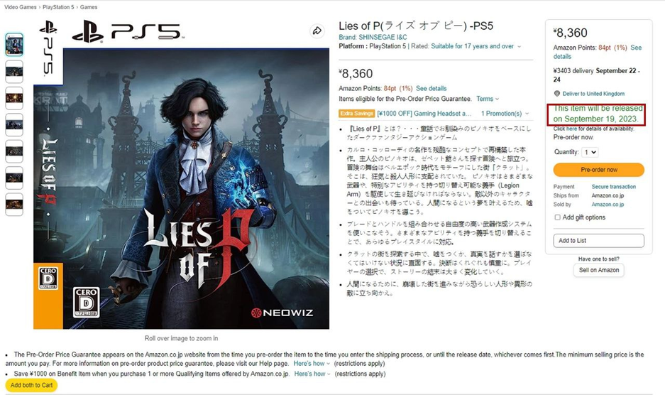 Тем временем на японском Amazon заметили дату на странице Lies of P. Получается, что релиз игры в духе Bloodborne может состояться 19 сентября 2023 года.