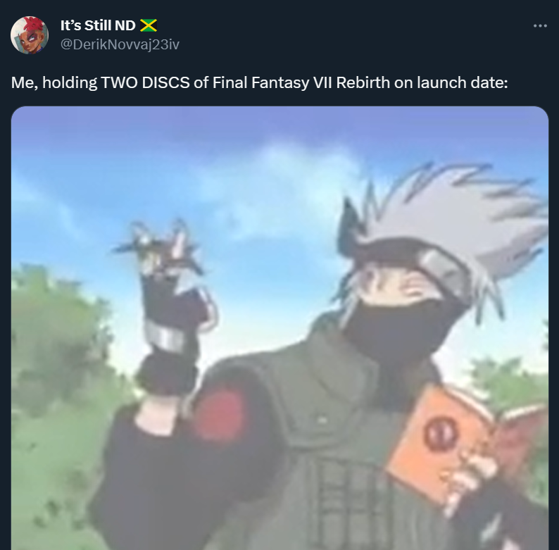 Сообщество отреагировало различными шутками. Кто-то просто смеялся над тем, что Final Fantasy 7 Rebirth выпускают сразу на двух дисках.