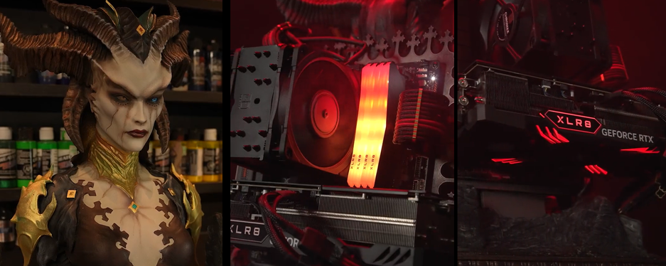 ПК выполнен в стиле Лилит из Diablo 4. Blizzard называет его «идеальной машиной для игры в Diablo 4», с производительностью поможет технология DLSS 3 (эксклюзив видеокарт RTX 40 серии).