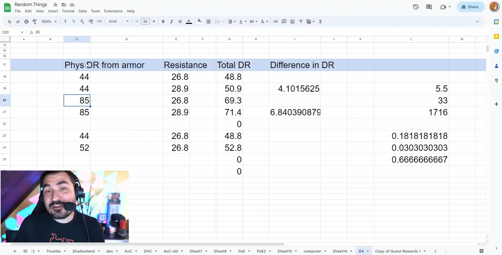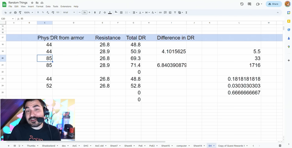 Kripparrian провёл эксперимент с узлами и снаряжением. Решил посчитать, сколько сопротивления получит: в первой колонке сопротивление урону от брони 44 (применяется половина т.е. остаётся 22); во второй сопротивление холоду 26.8. В итоге получилось 48.8 (сложил 22 и 26.8).