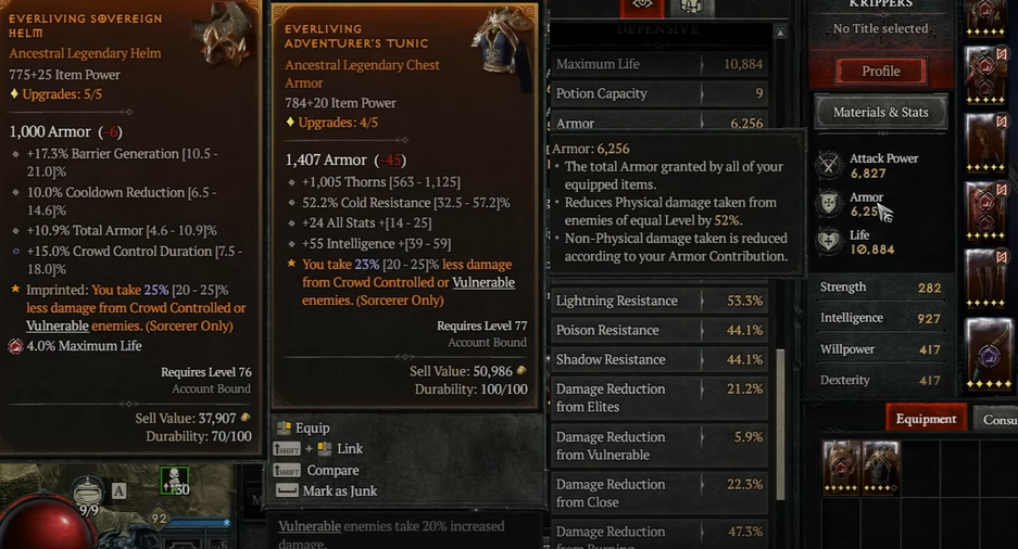 Затем сопротивление урону от брони оставил 44, а сопротивление холоду повысил до 28.9. В итоге получилось 50.9, разница составила примерно 4%. Блогер напомнил, что в Diablo 4 шесть типов урона, а броня даст общее сопротивление.