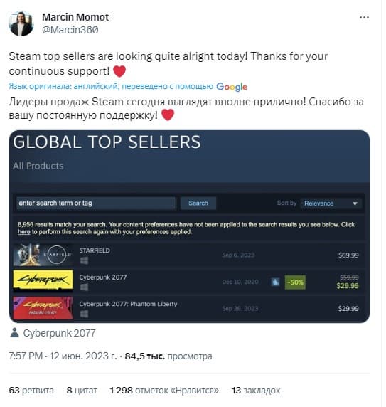 Лучшим примером заинтересованности игроков стали продажи Cyberpunk 2077 и Cyberpunk 2077: Phantom Liberty в Steam. Сейчас игра - второй самый продаваемый продукт на платформе Valve (после Starfield), а дополнение находится на четвертом месте (без учета условно-бесплатных игр и консолей).