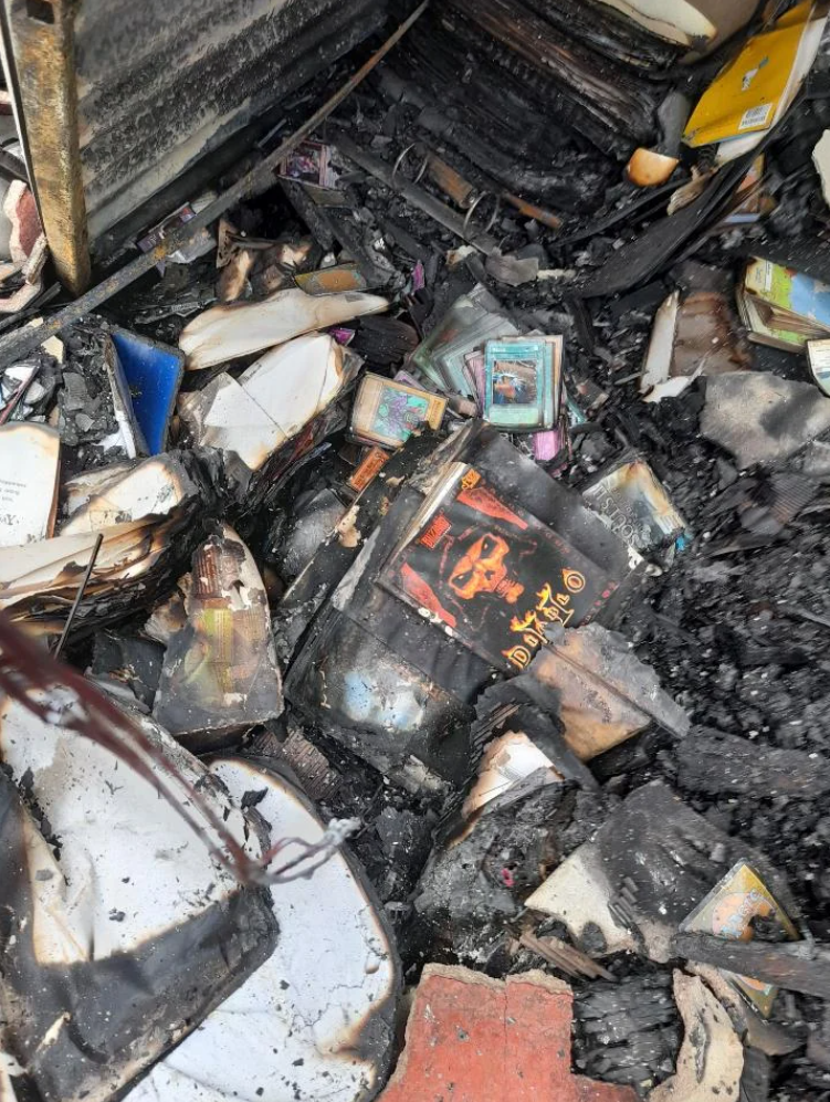 Оказалось, что физическая копия Diablo смогла успешно пережить пожар. Прямо в камеру направлен злобный взгляд с обложки. Рядом с физической копией игры Blizzard лежат потрёпанные коллекционные карточки, а также выглядывает одна из частей Dark Souls.