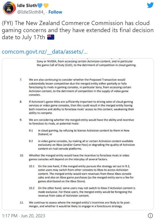 «(К сведению) Торговая комиссия Новой Зеландии обеспокоена облачными играми и продлила дату принятия окончательного решения до 17 июля».