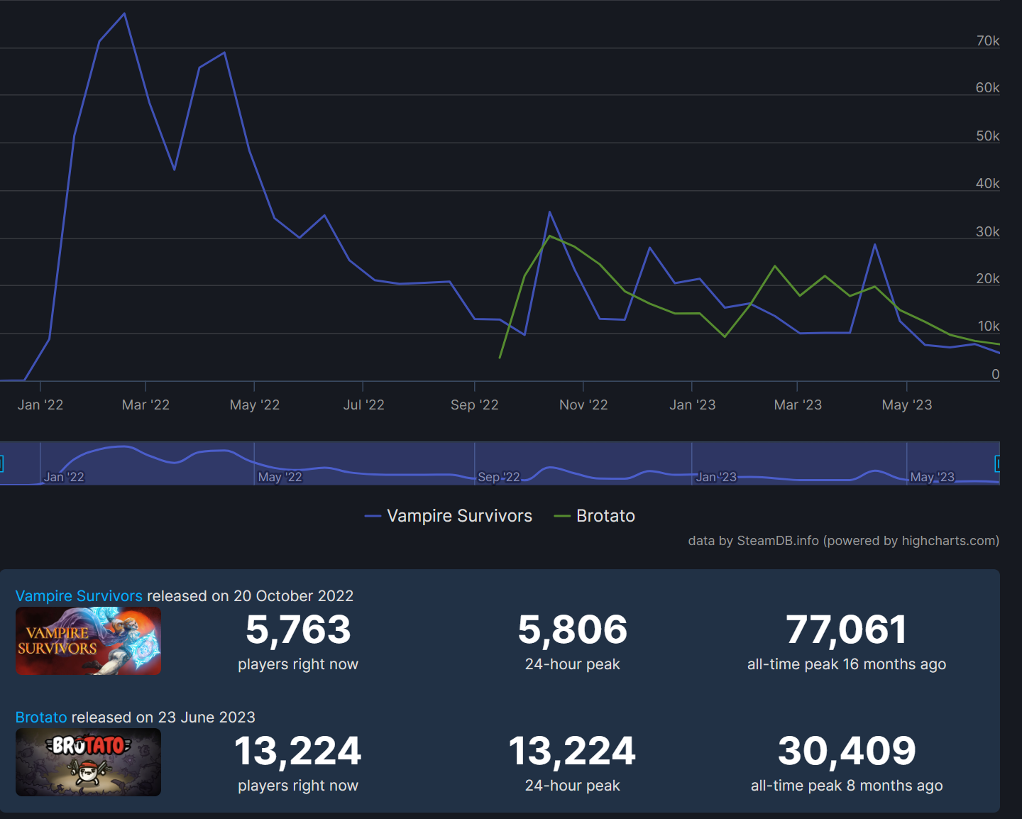 Рекордный онлайн Brotato значительно уступает Vampire Survivors, но в последнее время игры сопоставимы по суточному пиковому онлайну в Steam.