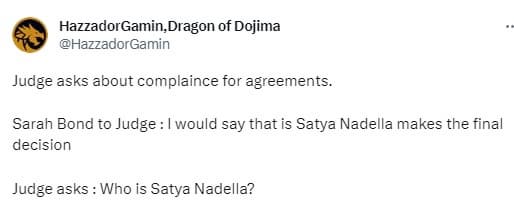 Интересно, что судья не знала, кто такой Сатья Наделла, генеральный директор компании Microsoft. Последующие вопросы показали, что FTC не совсем понимает, против чего возражает, а многие аргументы основаны на ошибочных предположениях и недостатках в понимании технологии и основ игровой индустрии.