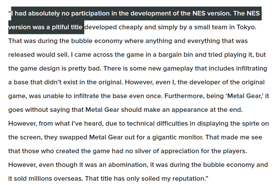 Хидео Кодзима откровенно презирает Metal Gear для NES (в разработке он не участвовал). В одном из интервью он называл игру «жалкой». По словам Кодзимы, она лишь запятнала его репутацию.