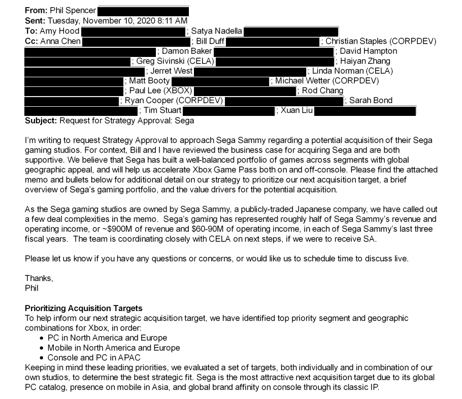 В ноябре 2020 года Фил Спенсер отправил электронное письмо исполнительному директору Сатье Наделле и финансовому директору Эми Худ, в котором просил одобрить приобретение студий Sega Sammy. Переписка вскрылась в рамках судебного разбирательства Microsoft и Федеральной торговой комиссии США.