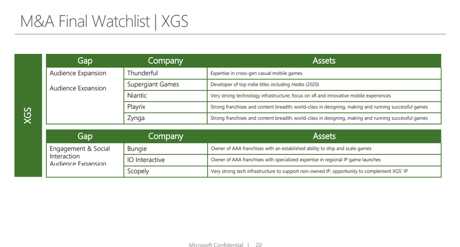 Что именно ответил Наделла господину Спенсеру неизвестно, однако Sega отсутствовала в финальном списке компаний, которые Microsoft считала перспективными приобретениями в апреле 2021 года. Весь список выглядит так: