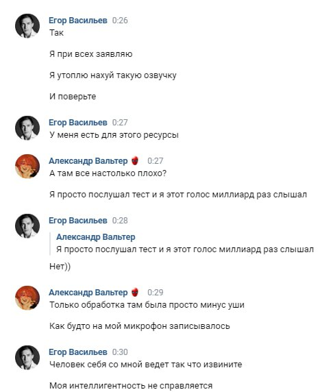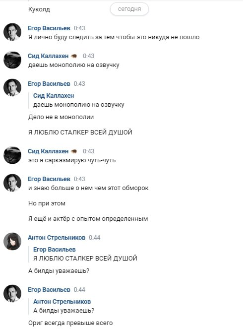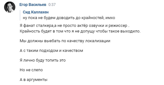 Если сообщения подлинные, то Егор мотивирует это так: «Я фанат сталкера, а не просто актёр озвучки и режиссер. Крайность будет в том что я не допущу чтобы такое выходило».