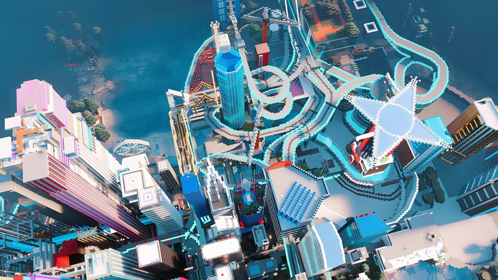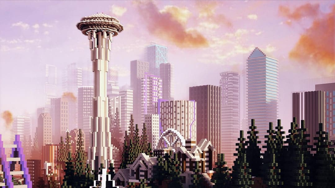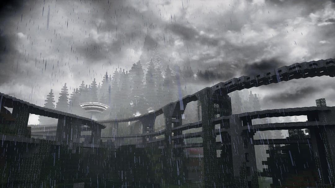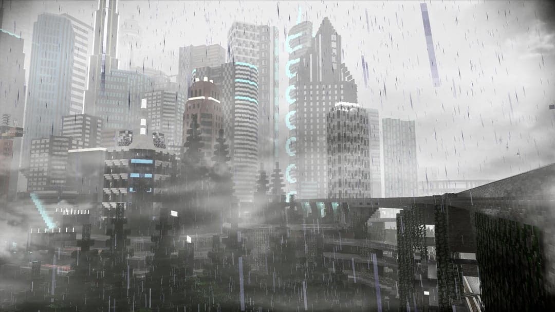 В наличии интересные архитектурные решения, кубические деревья и впечатляющие горы. В дождливую погоду город в Minecraft особенно атмосферно.