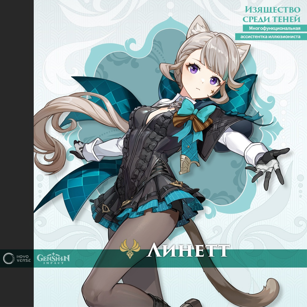 Линетт: ожидается с обновлением 4.0. Анемо-героиня, предполагаемая редкость 4 звезды; разработчиками позиционируется как «многофункциональная ассистентка иллюзиониста» и «елохвостая кошка».