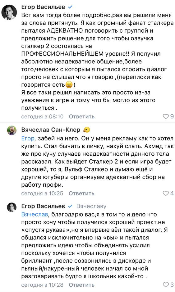 Недавно в сообществе «Вестник "Того Самого Сталкера"» объявили о том, что могут начать обсуждение русской озвучки S.T.A.L.K.E.R. 2 Heart of Chornobyl с GamesVoice, участие в проекте мог бы принять актёр Егор Васильев. Вскоре появилась примечательная переписка.