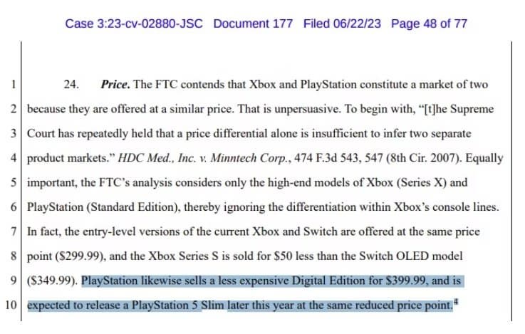 В ходе судебного разбирательства Microsoft и Федеральной торговой комиссией США всплыли документы, согласно которым, до конца текущего года Sony выпустит более дешевую Slim-версию консоли PlayStation 5. Устройство якобы также не будет снабжено оптическим приводом. Стоимость PlayStation 5 Slim будет ниже, чем у цифровой ревизии PlayStation 5, которая сейчас стоит 400 американских долларов (должна стоить официально, во всяком случае).