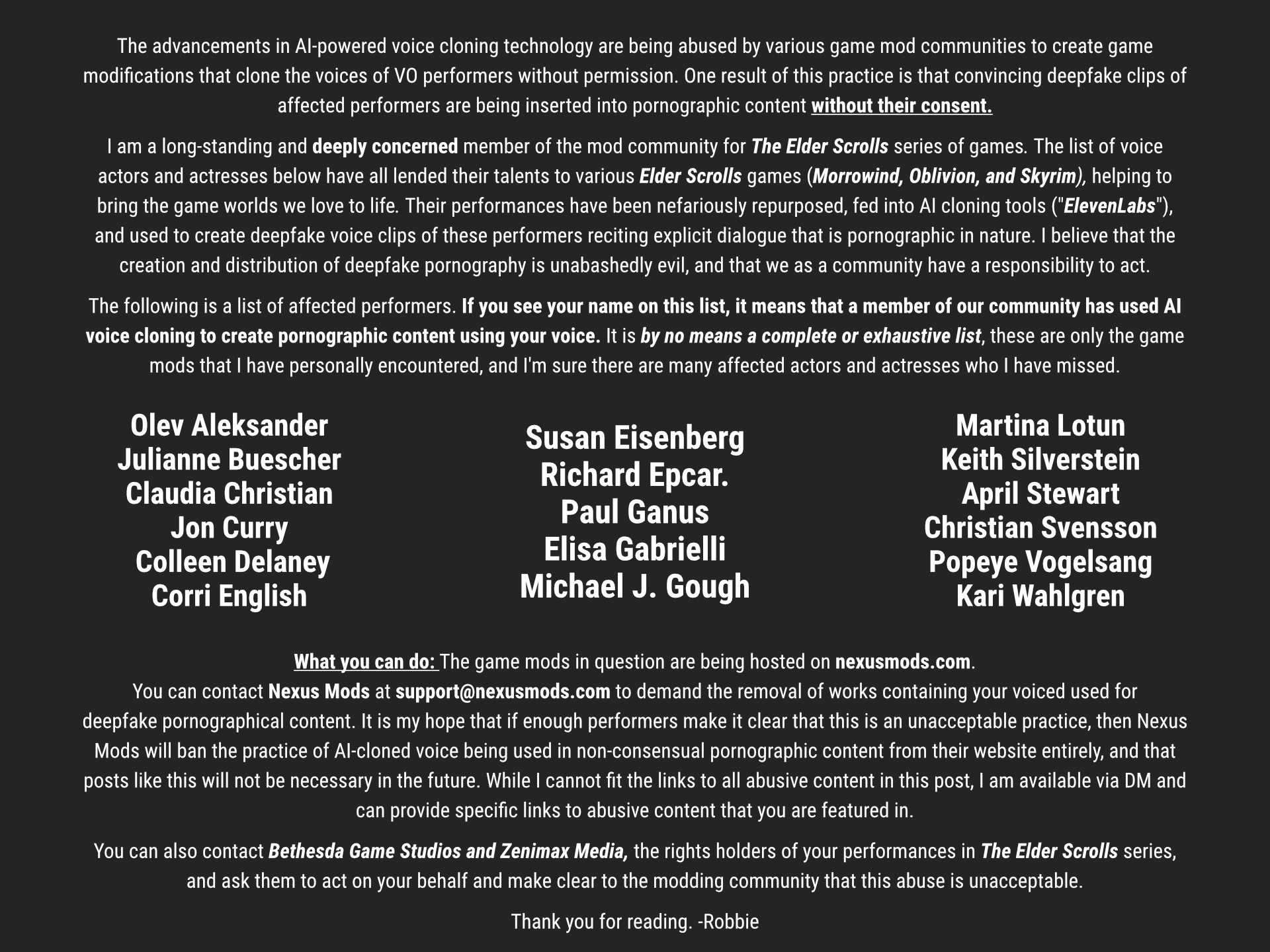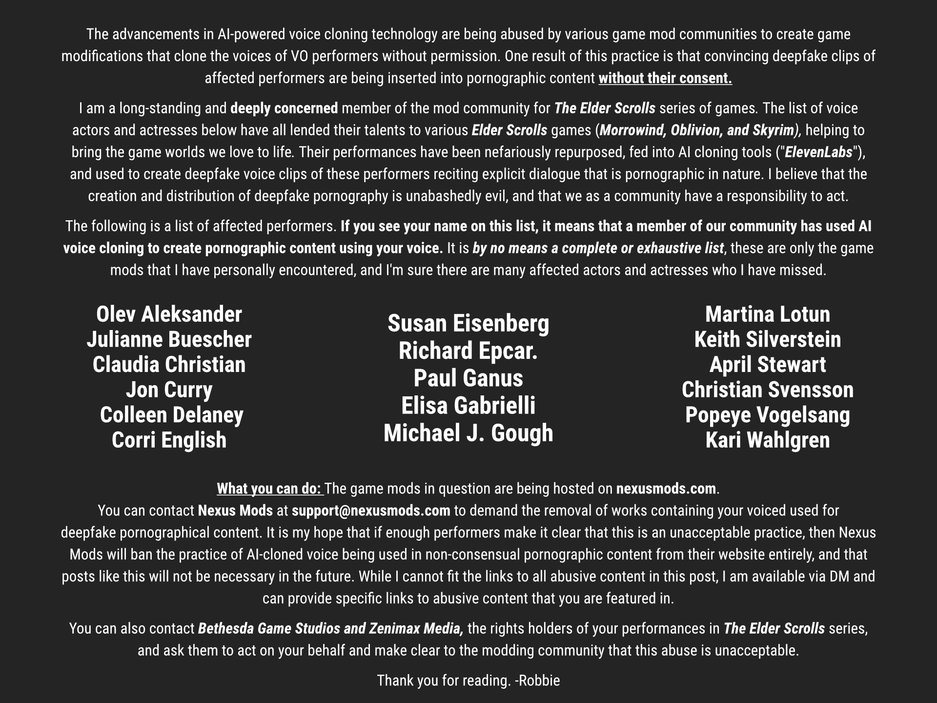 Robbie92_ решил составить список актёров, голоса которых создавались ИИ для подобных эротических модов: Корри Инглиш, Клаудия Кристиан, Эйприл Стюарт и многие другие. Он предложил актёром связаться с Nexus Mods и потребовать удалить контент, содержащий копию голоса. Список модов со ссылками энтузиаст тоже составил, можно найти здесь; некоторые моды на Nexus Mods уже скрыли.