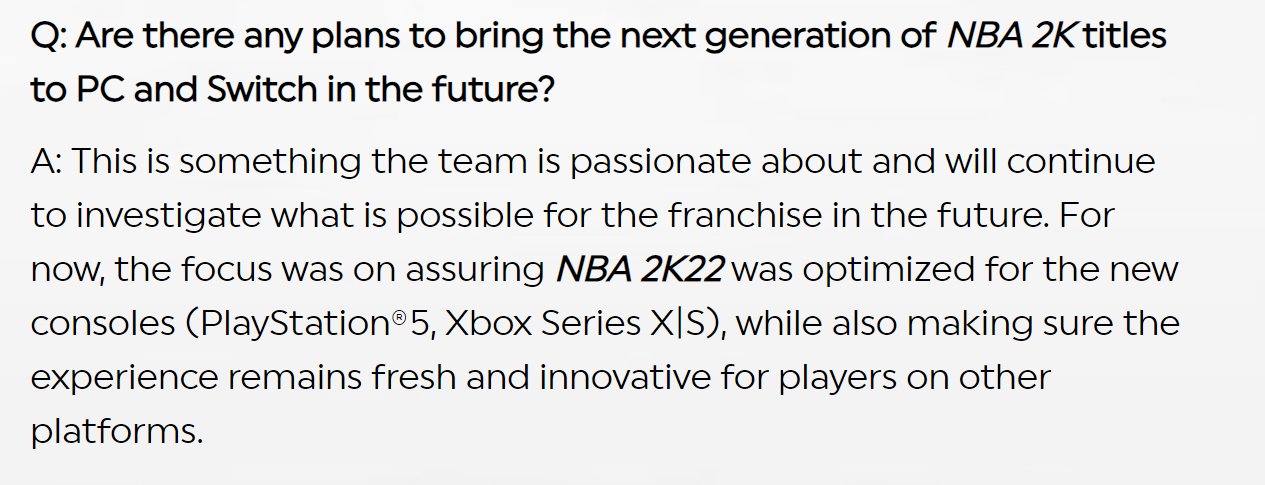 У NBA 2K22 - 23 в FAQ ранее был следующий пункт, разработчики отвечали о планах на некстген версию на ПК, а у NBA 2K24 такого пункта пока нет.