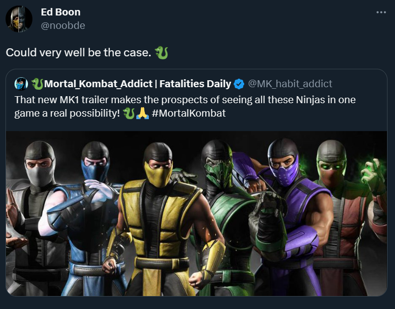 Эд Бун написал в ответ многозначительное: «Вполне возможно, что так и будет». Это дало надежду поклонникам на то, что в Mortal Kombat 1 заглянет Ермак и Рептилия.