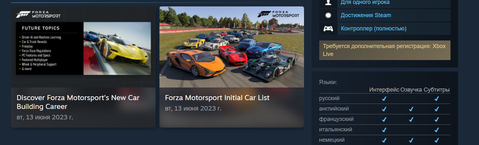 Недавно страницу Forza Motorsport в Steam обновили, теперь для гоночной игры Turn 10 заявлен перевод на русский язык. Пока лишь субтитры и интерфейс, без озвучки. У Starfield пока без изменений и «русский язык не поддерживается».