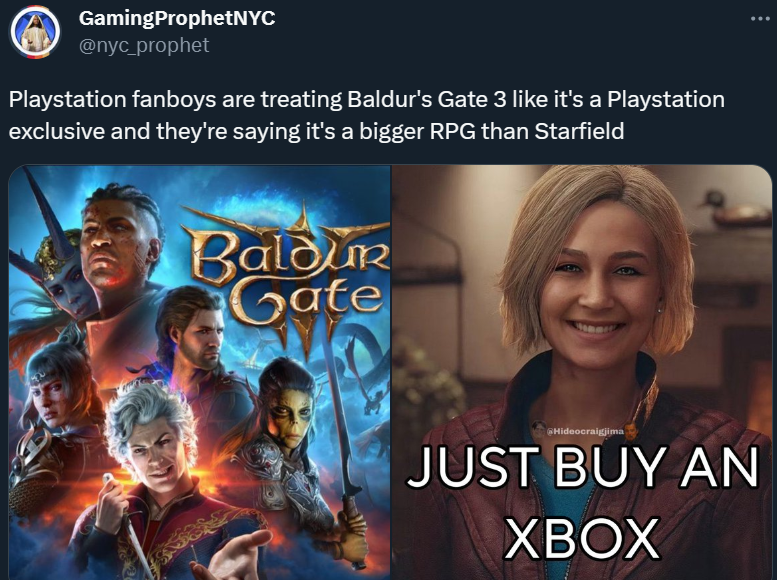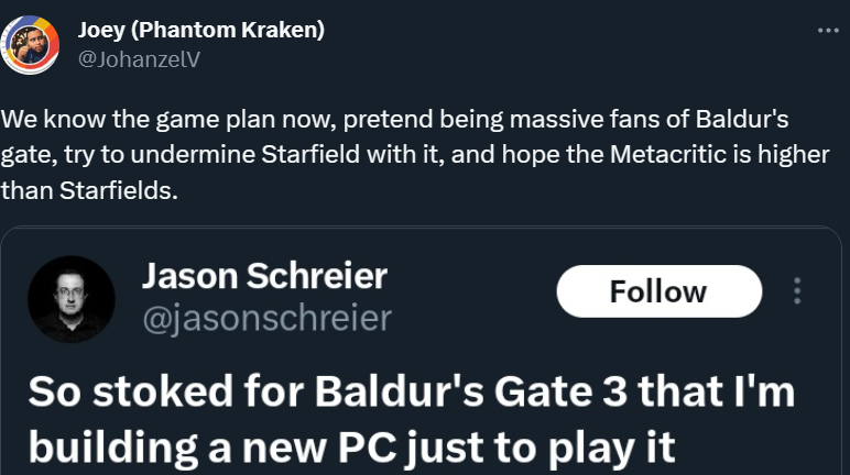 «Теперь мы знаем план: притвориться большими поклонниками Baldur's Gate, попытаться уколоть ею Starfield и надеяться, что [оценка BG3 на Metacritic] окажется выше, чем у Starfield».