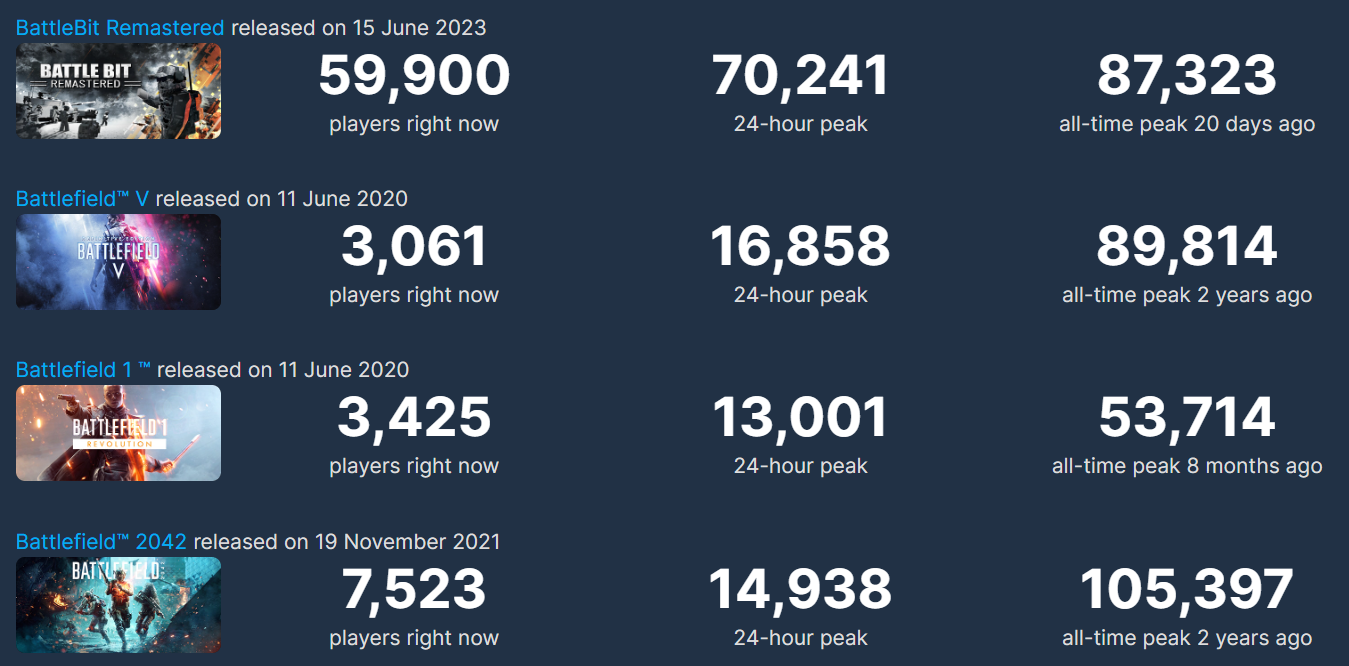 Некоторые персоны даже стали ставить BattleBit Remastered выше Battlefield 2042 (на релизе игра вышла очень сломанной; патчи её подправили, но интерес к проекту уже заметно ниже).