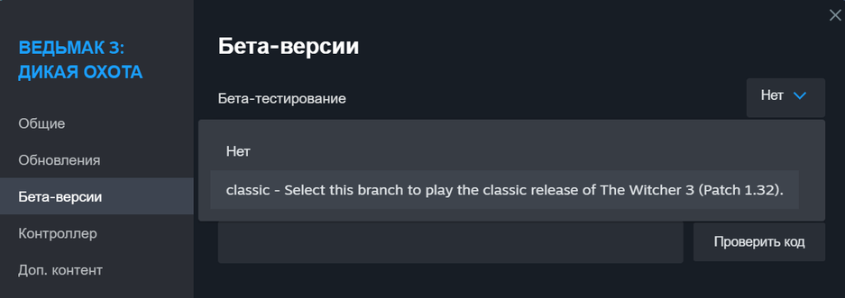 В Steam можно вернуть The Witcher 3 Wild Hunt версии 1.32, для этого надо перейти в Свойства -> Бета-версии -> classic (для вызова списка надо нажать на кнопку «Нет»)